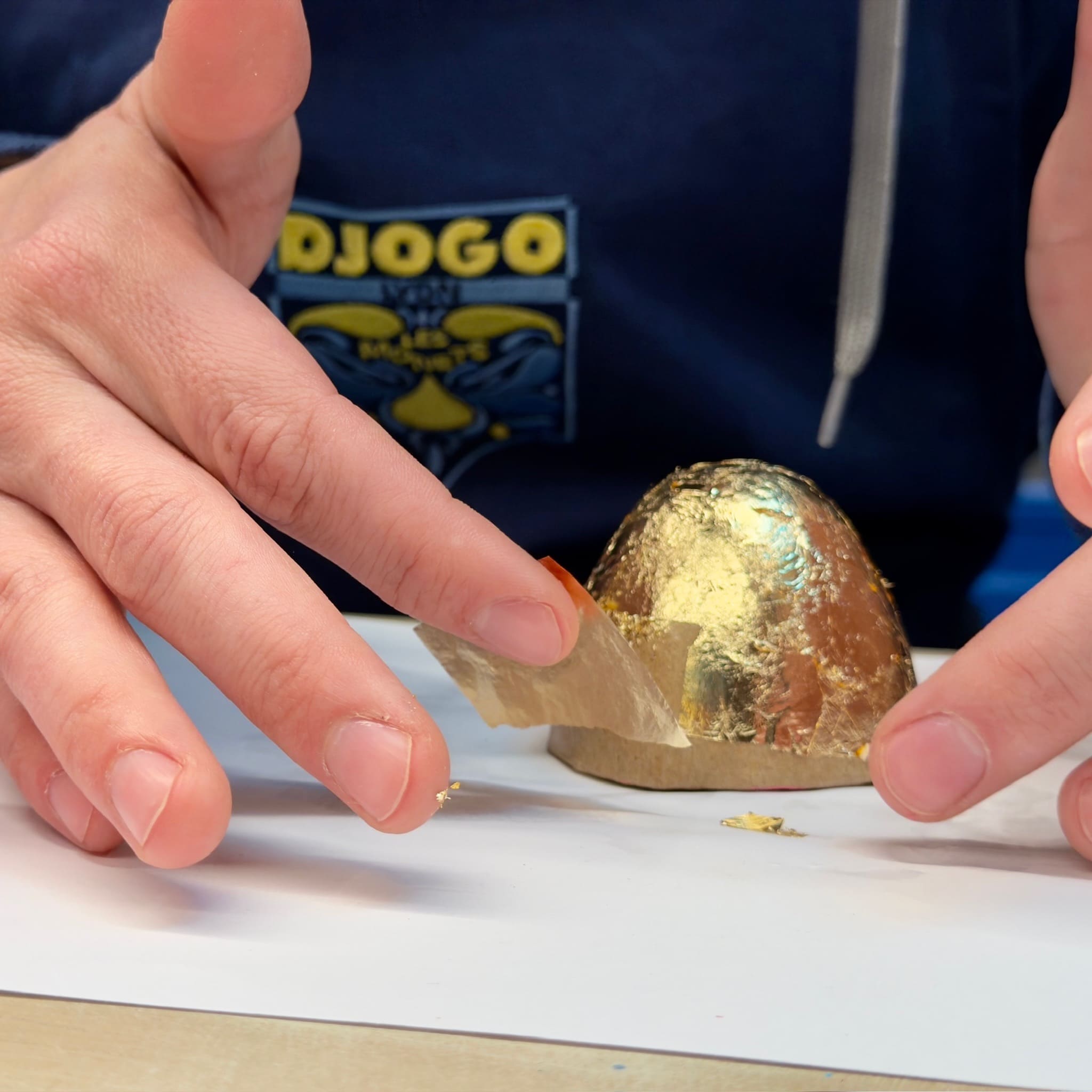 Le défi ? Apprivoiser la feuille de cuivre, une matière dix fois plus fine qu'un cheveu. Il apprendra à poser la mixtion avec précision et à attendre l'instant précis où la matière "chante" pour accueillir le métal.