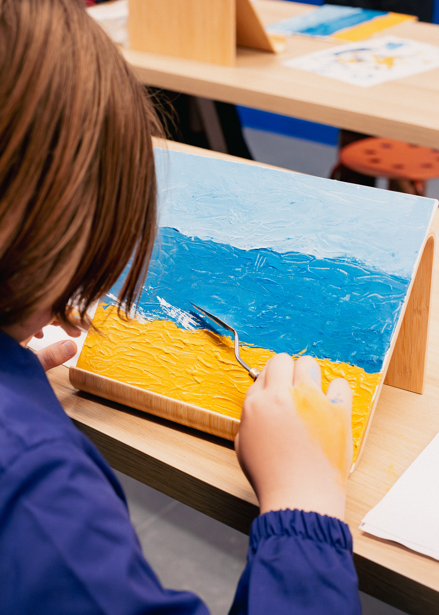 • Accueil et découverte de l'atelier : l'animateur vous accueille chaleureusement dans un univers coloré, avec des toiles vierges et une variété de couteaux de peinture. Vous apprenez les bases de la peinture au couteau et comment représenter les éléments d’une plage : sable, mer, vagues et horizon.